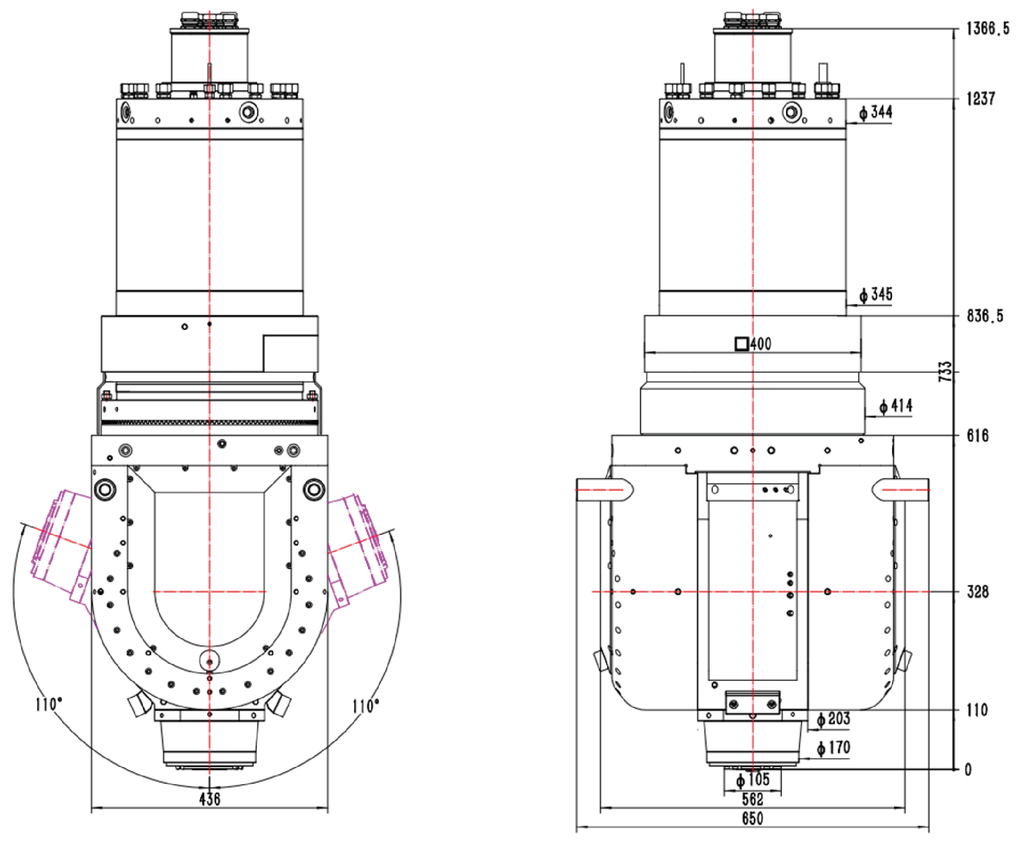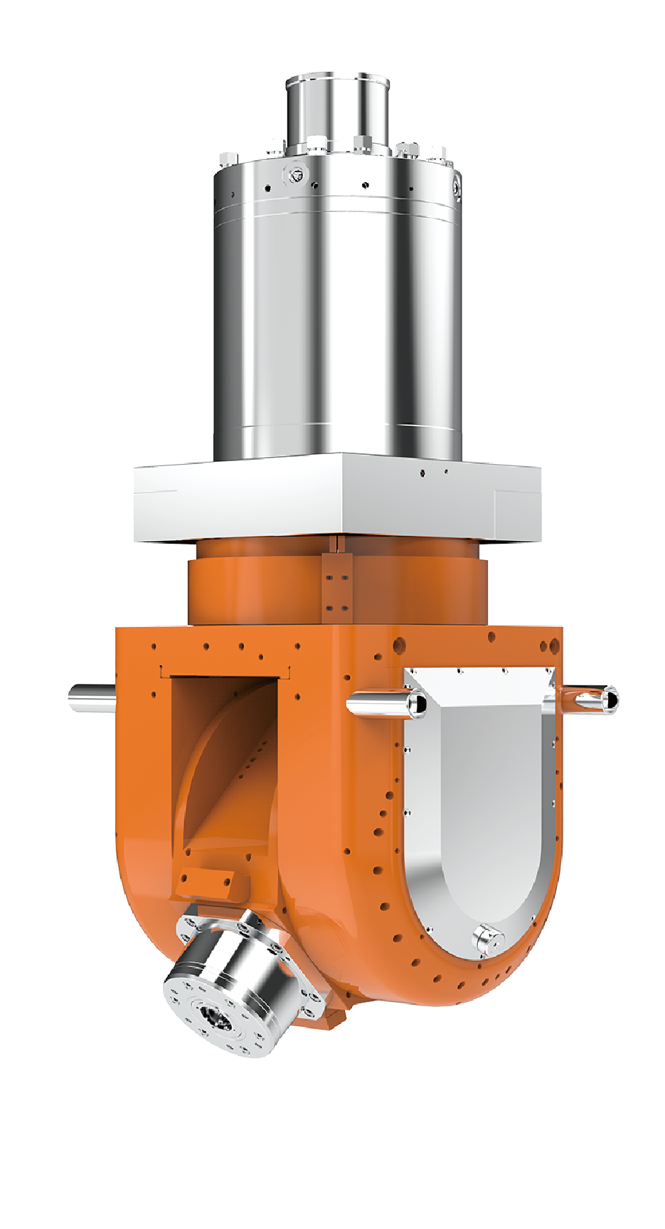 双摆铣头进一步提升产品的静态精度、动态精度、切削能力,形成系列化产品。内置特殊开发的内转子式的大扭矩力矩电机,区别于传统的齿轮传动或蜗轮蜗杆传动方式,具有更高的动态特性和更好的精度保持性。结合全数字力矩电机伺服驱动器,以及编码器分辨率提升技术和误差校正技术,实现双摆角数控万能铣头连续分度,达到5角秒的定位精度。
